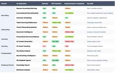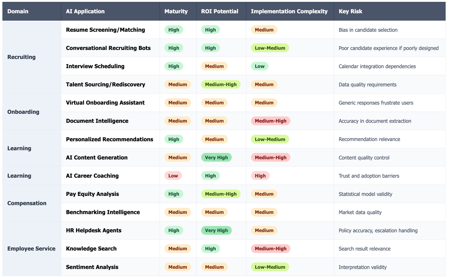 Primary use cases: Resume screening, chatbots, predictive analytics, content generation
