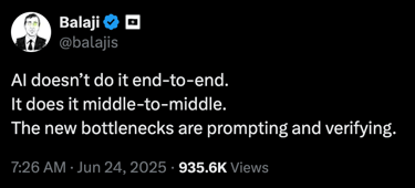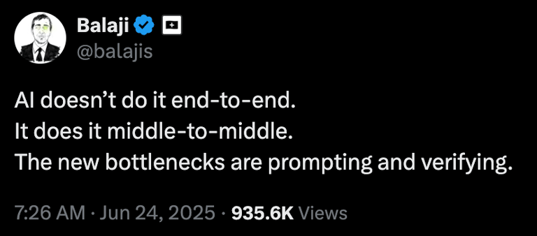 Human is end-to-end, AI is middle-to-middle: New bottlenecks are prompt engineering and verification capacity, not execution speed. This elevates, not eliminates, the human role