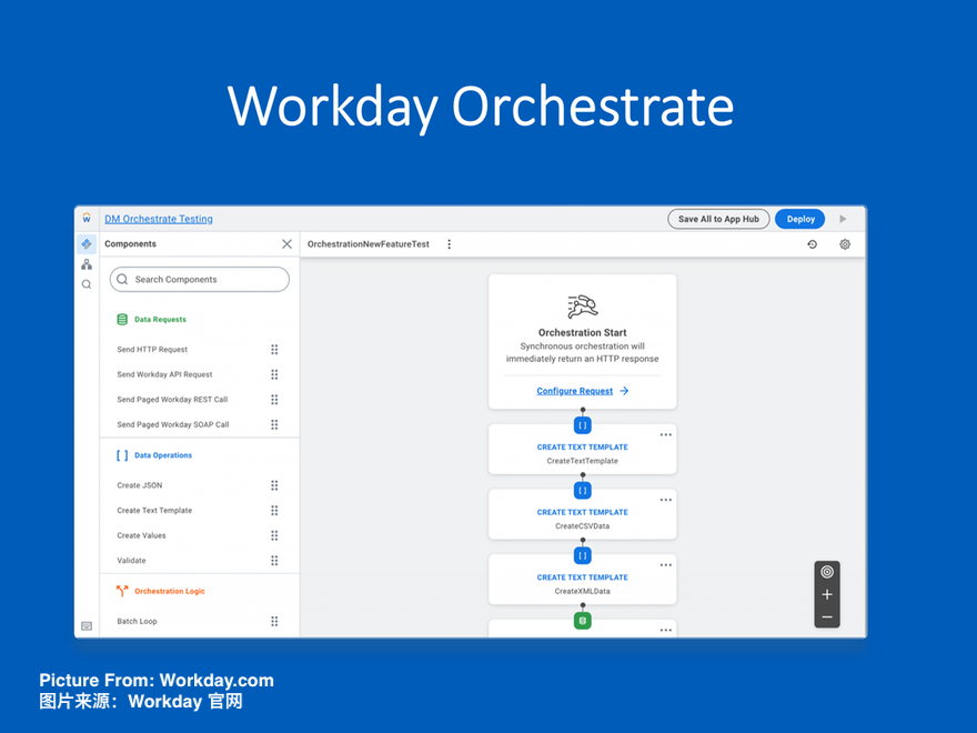 3. 与 Extend 协同,打造端到端体验: Orchestrate 与 Workday Extend 可形成端到端闭环。开发人员可利用 Orchestrate,将 Workday 原生数据或第三方系统数据,通过自定义逻辑“打包”成全新的 API,以供 Extend 应用消费。这样既可大大提升 Extend 应用开发的灵活性,也能改善应用性能与用户体验。